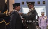 REPUBLIKA.CO.ID,JAKARTA -- Menteri Pertahanan Prabowo Subianto menerima Bintang Kehormatan Yudha Dharma Utama dari Panglima TNI Jenderal TNI Andika Perkasa (kanan) pada acara Penyematan Bintang Kehormatan TNI di Kantor Kemenhan, Jakarta, Senin (15/8/2022).
