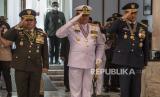 KASAD Jenderal TNI Dudung Abdurachman (kiri(, KASAL Laksamana TNI Yudo Margono (tengah) dan KASAU Marsekal TNI Fadjar Prasetyo (kanan) menghadiri acara Penyematan Bintang Kehormatan TNI di Kantor Kemenhan, Jakarta, Senin (15/8/2022). Dalam acara tersebut Menhan Prabowo Subianto menerima empat bintang kehormatan atas jasanya terhadap TNI yaitu Bintang Yudha Dharma Utama dari TNI, Bintang Kartika Eka Pakci Utama dari TNI AD, Bintang Jalasena Utama dari TNI AL dan Bintang Swabhuwana Pakca Utama dari TNI AU. (FOTO : ANTARA/Muhammad Adimaja)