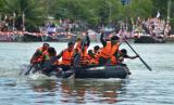 Peserta memacu perahu karetnya saat mengikuti perlombaan Festival Merah Putih di Sungai Krueng Aceh, Banda Aceh, Senin (15/8/2022). Festival Merah Putih yang dimeriahkan parade perahu hias, lomba perahu karet dan atraksi Jetski yang melibatkan TNI,Polri, BUMN, Basarnas dan masyarakat itu dalam rangka menyambut perayaan HUT ke-77 Kemerdekaan RI. (FOTO : ANTARA/Ampelsa)