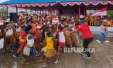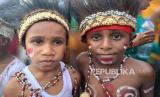 REPUBLIKA.CO.ID,Dua anak mengikuti karnaval budaya dengan mengenakan pakaian adat Papua di Lapangan Yos Sudarso, Agats, Asmat, Papua Selatan, Senin (15/8/2022).