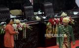Presiden Joko Widodo bersama Wakil Presiden KH Maruf Amin memberi salam kepada anggota DPR yang hadir dalam sidang tahunan MPR dan Sidang Bersama DPR-DPD di Komplek Parlemen, Senayan, Jakarta, Selasa (16/8/2022). Prayogi/Republika (FOTO : Prayogi/Republika.)