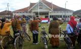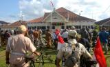 Anggota Paguyuban Onthel Djogjakarta (Podjok) mengikuti Upacara 17 Agustus di Halaman Ndalem Kepatihan Pura Pakualaman, Yogyakarta, Rabu (17/8/2022). Podjok bersama Perempuan Berkebaya mengadakan Upacara Hari Kemerdekaan 17 Agustus dengan teman zaman dulu. Untuk Onthelis menggunakan pakaian tentara atau pakaian peranakan Jawa. Tidak lupa onthel yang dibawa juga ikut dipajang saat upacara. (FOTO : Republika/Wihdan Hidayat)