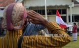 Prosesi pengibaran bendera merah putih saat Upacara 17 Agustus bersama Anggota Paguyuban Onthel Djogjakarta (Podjok) di Halaman Ndalem Kepatihan Pura Pakualaman, Yogyakarta, Rabu (17/8/2022). Podjok bersama Perempuan Berkebaya mengadakan Upacara Hari Kemerdekaan 17 Agustus dengan teman zaman dulu. Untuk Onthelis menggunakan pakaian tentara atau pakaian peranakan Jawa. Tidak lupa onthel yang dibawa juga ikut dipajang saat upacara. (FOTO : Republika/Wihdan Hidayat)