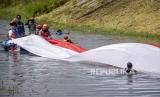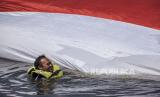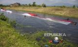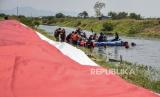 Relawan membentangkan kain merah putih di Sungai Cikijing, Rancaekek, Kabupaten Bandung, Rabu (17/8/2022). Pembentangan kain merah putih sepanjang 3x77 meter oleh Unit SAR Kota Bandung, Komunitas Passer dan sejumlah organisasi relawan tersebut dilakukan dalam rangka memperingati HUT Ke-77 Republik Indonesia. (FOTO : REPUBLIKA/ABDAN SYAKURA)
