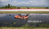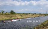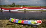 REPUBLIKA.CO.ID, BANDUNG -- Sejumlah relawan menggunakan kayak beraktivitas di dekat kain merah putih yang dibentangkan di bantaran Sungai Cikijing, Rancaekek, Kabupaten Bandung, Rabu (17/8/2022).