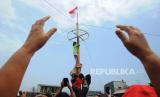 Sejumlah warga ibu-ibu mengikuti lomba panjat pinang saat memeriahkan HUT RI Ke 77 di Kampung Kerang Hijau, Cilincing, Jakarta Utara, Rabu (17/08/2022). Tahta Aidilla/Republika. (FOTO : Tahta Aidilla/Republika)
