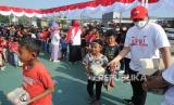 Relawan Indonesia Financial Group (IFG) memberikan bingkisan kepada anak-anak saat memeriahkan upacara HUT RI ke 77 di Kampung Kerang Hijau, Cilincing, Jakarta, Rabu (17/8/2022). IFG bersama warga memeriahkan HUT dengan mengadakan upacara dan aneka lomba juga memberikan bantuan Tanggung Jawab Sosial Lingkungan (TJSL). Foto: Tahta Aidilla/Republika. (FOTO : Tahta Aidilla/Republika)