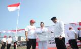 Direktur Teknik Indonesia Financial Group (IFG) Rianto Ahmadi (kiri) secara simbolis memberikan bantuan Tanggung Jawab Sosial Lingkungan (TJSL) kepada perwakilan warga Kampung Kerang Hijau Sudirman (tengah) didampingi Direktur Utama Askrindo Priyastomo (kanan) disela-sela pelaksanaan perayaan HUT ke 77 Kemerdekaan Republik Indonesia antara IFG dan anak perusahaan bersama warga kampung kerang hijau di Kalibaru, Cilincing, Jakarta Utara. Rabu (17/82022). Juga dilaksanakan lomba untuk warga yang tahun-tahun sebelumnya ditiadakan. Foto: Tahta Aidilla/Republika. (FOTO : Tahta Aidilla/Republika)
