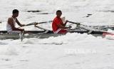 REPUBLIKA.CO.ID, JAKARTA -- Pedayung nomor rowing DKI Jakarta Aditya Maulana Putra (kanan) dan Muhammad Rafli berlatih di antara busa-busa limbah di Sungai Banjir Kanal Timur, Marunda, Jakarta, Rabu (17/8/2022).