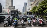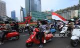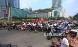 Sejumlah komunitas sepeda motor berhenti untuk mengheningkan cipta saat konvoi di Bundaran HI, Jakarta, Rabu (17/8/2022). Konvoi tersebut dalam rangka memeriahkan Peringatan HUT ke-77 Republik Indonesia Tahun 2022. (FOTO : ANTARA FOTO/Reno Esnir)