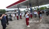 Petugas SPBU bersama konsumen mengikuti prosesi hening cipta dan penghormatan di SPBU Yos Sudarso, Palangka Raya, Kalimantan Tengah, Rabu (17/8/2022). Mengheningkan cipta bersama pada pukul 10.17 WIB selama tiga menit tersebut dilakukan untuk peringatan detik-detik pembacaan proklamasi dalam rangka peringatan HUT ke-77 Kemerdekaan RI sekaligus mengenang jasa para pahlawan. (FOTO : ANTARA/Makna Zaezar)