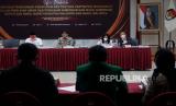Anggota KPU August Mellaz (dua kiri) didampingi Anggota KPU Mochammad Afifuddin (kiri) saat menyampaikan presentasi uji publik Terhadap Rancangan Peraturn KPU Tentang Partisipasi Masyarakat dalam Pemilihan Umum dan Pemilihan Gubernur dan Wakil Gubernur, Bupati dan Wakil Bupati dan/atau Walikota dan Wakil Walikota di Gedung KPU, Jakarta, Kamis (18/8/2022). Rancangan peraturan KPU tersebut diharapkan mampu meningkatkan partisipasi masyarakat serta mewujudkan penyelenggaraan pemilihan umum yang lebih demokratis. (FOTO : Prayogi/Republika.)