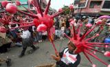 Peserta karnaval membawa simbol virus corona saat melintas di jalan Merdeka Utama, Lhokseumawe, Aceh, Kamis (18/8/2022). Karnaval dalam rangka memeriahkan HUT ke-77 Kemerdekaan RI yang diikuti pelajar dari 128 sekolah tingkat TK, SD, SMP, SMA/MA tersebut bertujuan menanamkan rasa patriotisme dan menggali kreativitas generasi muda serta cinta keberagaman adat budaya Indonesia. (FOTO : ANTARA/RAHMAD)