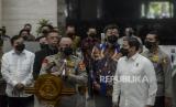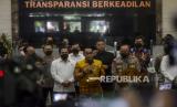 Ketua Tim Gabungan Khusus Polri yang juga Irwasum Polri Komjen Agung Budi Maryoto (kedua kanan) bersama Kabareskrim Polri Komjen Agus Andrianto (ketiga kiri), dan Kadiv Humas Polri Irjen Dedi Prasetyo (kedua kiri) memberikan keterangan saat konferensi pers di Mabes Polri, Jakarta, Jumat (19/8/2022). Polri menetapkan istri mantan Kadiv Propam Polri Irjen Ferdy Sambo, Putri Candrawathi sebagai tersangka pada kasus pembunuhan Brigadir Yosua Hutabarat, berdasarkan pemeriksaan mendalam dengan scientific crime investigation, alat bukti dan gelar perkara. Republika/Putra M. Akbar (FOTO : Republika/Putra M. Akbar)