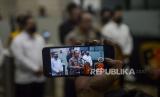 Layar gawai yang menunjukan Ketua Tim Gabungan Khusus Polri yang juga Irwasum Polri Komjen Agung Budi Maryoto (tengah) bersama Kabareskrim Polri Komjen Agus Andrianto (kiri) memberikan keterangan saat konferensi pers di Mabes Polri, Jakarta, Jumat (19/8/2022). Polri menetapkan istri mantan Kadiv Propam Polri Irjen Ferdy Sambo, Putri Candrawathi sebagai tersangka pada kasus pembunuhan Brigadir Yosua Hutabarat, berdasarkan pemeriksaan mendalam dengan scientific crime investigation, alat bukti dan gelar perkara. Republika/Putra M. Akbar (FOTO : Republika/Putra M. Akbar)
