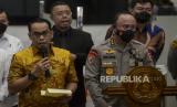 REPUBLIKA.CO.ID,JAKARTA -- Ketua Tim Gabungan Khusus Polri yang juga Irwasum Polri Komjen Agung Budi Maryoto bersama Dirtipidum Bareskrim Polri Brigjen Pol Andi Rian Djajadi memberikan keterangan saat konferensi pers di Mabes Polri, Jakarta, Jumat (19/8/2022).