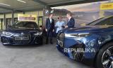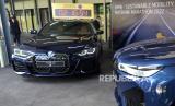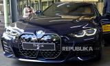Mobil BMW i4 dihadirkan saat seremonial serah terima kendaraan listrik BMW iX, BMW i4 dan MINI di Tangerang, Banten, Jumat (19/8/2022). BMW Group Indonesia bersama dengan PT Bank Maybank Indonesia, Tbk. (Maybank Indonesia) melakukan serah terima rangkaian kendaraan BMW yang akan menjadi Lead Car di Maybank Marathon 2022 sebagai dukungan ajang marathon yang mendapatkan elite label road race marathon dari World Athletics dan rutin diadakan selama satu dekade ke belakang tersebut. (FOTO : Republika/Edwin Dwi Putranto)