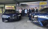 Managing Director BMW Group Asia Lars Nielsen (keempat kanan), President Director BMW Group Indonesia Ramesh Divyanathan (ketiga kiri), Director Operations Maybank Indonesia sekaligus Project Director Maybank Marathon 2022 Widya Permana (keempat kiri) dan Direktur Komunikasi BMW Group Indonesia Jodie O’tania (kedua kanan) berfoto bersama saat seremonial serah terima kendaraan listrik BMW iX, BMW i4 dan MINI di Tangerang, Banten, Jumat (19/8/2022). BMW Group Indonesia bersama dengan PT Bank Maybank Indonesia, Tbk. (Maybank Indonesia) melakukan serah terima rangkaian kendaraan BMW yang akan menjadi Lead Car di Maybank Marathon 2022 sebagai dukungan ajang marathon yang mendapatkan elite label road race marathon dari World Athletics dan rutin diadakan selama satu dekade ke belakang tersebut. (FOTO : Republika/Edwin Dwi Putranto)