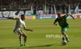 Gelandang PSS Sleman Ze Valente mencoba melewati penyerang Persib Bandung Ciro Alves pada pertandingan Liga 1 2022 di Stadion Maguwoharjo, Sleman, Yogyakarta, Jumat (19/8/2022). Pada pertandingan ini tuan rumah PSS Sleman mengakui keunggulan Persib Bandung dengan skor 0-1. Gol tunggal Persib dicetak oleh penyerang Persib Bandung David Da Silva. (FOTO : Republika/Wihdan Hidayat)