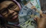 REPUBLIKA.CO.ID,BANDUNG -- Warga menunjukkan pecahan uang rupiah kertas terbaru saat penukaran di Gedung Sate, Bandung, Jawa Barat, Jumat (19/8/2022).