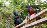 Burung nuri kabare (Psittrichas fulgidus) (kanan) dan kakatua raja (Probosciger aterrimus) (kiri) bertengger di kayu saat dilepasliarkan di Hutan Adat Isyo, Kampung Rhepang Muaif, Distrik Nimbokrang, Jayapura, Papua, Sabtu (20/8/2022). Balai Besar Konservasi Sumber Daya Alam (BBKSDA) Papua melepasliarkan 17 satwa jenis aves yaitu dua ekor nuri kabare (Psittrichas fulgidus), tiga ekor kakatua raja (Probosciger aterrimus), delapan ekor kasturi kepala hitam (Lorius lory), tiga ekor nuri bayan (Eclectus roratus), dan seekor kakatua koki (Cacatua galerita). (FOTO : ANTARA/Sakti Karuru)