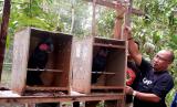 REPUBLIKA.CO.ID,JAYAPURA -- Burung nuri kabare (Psittrichas fulgidus) bertengger dalam sangkar sebelum dilepasliarkan di Hutan Adat Isyo, Kampung Rhepang Muaif, Distrik Nimbokrang, Jayapura, Papua, Sabtu (20/8/2022).