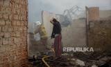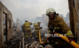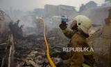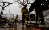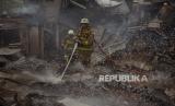 Petugas Penanggulangan Kebakaran dan Penyelamatan (Gulkarmat) melakukan proses pendinginan di lokasi kebakaran pemukiman di kawasan Simprug Golf II, Kebayoran Lama, Jakarta Selatan, Ahad (21/8/2022). Kebakaran tersebut terjadi sekitar pukul 10.48 WIB yang diduga akibat korsleting listrik di salah satu kontrakan di kawasan tersebut. Sementara menurut Kepala Seksi Operasi Suku Dinas Penanggulangan Kebakaran dan Penyelamatan Jakarta Selatan, sekitar 100 rumah ludes terbakar dalam kejadian tersebut. (FOTO : Republika/Thoudy Badai)