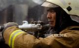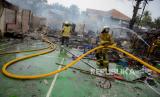 Petugas Penanggulangan Kebakaran dan Penyelamatan (Gulkarmat) melakukan proses pendinginan di lokasi kebakaran pemukiman di kawasan Simprug Golf II, Kebayoran Lama, Jakarta Selatan, Ahad (21/8/2022). (FOTO : Republika/Thoudy Badai)
