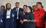 REPUBLIKA.CO.ID,JAKARTA -- Ketua DPP PDIP Puan Maharani dan Ketua Umum Partai Nasdem Surya Paloh memberikan keterangan usai pertemuan di Kantor DPP Nasdem, Jakarta, Senin (22/8/2022).