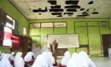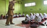 Seorang Guru (tengah) memberikan materi pembelajaran kepada sejumlah siswi SDN (Sekolah Dasar Negeri) Sukadaya 02 tanpa bangku dan meja di Sukawangi, Kabupaten Bekasi, Jawa Barat, Senin (22/8/2022). Menurut keterangan pihak sekolah sudah 5 tahun satu ruang kelas tidak memiliki meja dan bangku belajar. (FOTO : ANTARA/Fakhri Hermansyah)
