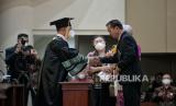 Ayah Brigadir Nofriansyah Yosua Hutabarat, Samuel Hutabarat (kanan) menerima ijazah dari Rektor Universitas Terbuka (UT) Ojat Darojat (kiri) saat mewakili anaknya mengikuti prosesi wisuda di Universitas Terbuka (UT) di Pamulang, Tangerang Selatan, Banten, Selasa (23/8/2022). Brigadir J tercatat sebagai mahasiswa Program Studi Ilmu Hukum, Fakultas Hukum dan Ilmu Sosial dan Ilmu Politik di Unit Program Belajar Jarak Jauh Universitas Terbuka Jambi yang terdaftar sejak 2015. Dia lulus memuaskan dengan IPK 3,28. Kehadiran Ayahnya saat prosesi wisuda didampingi saudaranya Ramos Hutabarat dan kerabat satu marga Irma Hutabarat. (FOTO : Republika/Thoudy Badai)