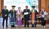 Ayah Brigadir Nofriansyah Yosua Hutabarat, Samuel Hutabarat (ketiga kanan), Rektor Universitas Terbuka (UT) Ojat Darojat (kedua kiri) berfoto bersama saat mewakili anaknya mengikuti prosesi wisuda di Universitas Terbuka (UT) di Pamulang, Tangerang Selatan, Banten, Selasa (23/8/2022). Brigadir J tercatat sebagai mahasiswa Program Studi Ilmu Hukum, Fakultas Hukum dan Ilmu Sosial dan Ilmu Politik di Unit Program Belajar Jarak Jauh Universitas Terbuka Jambi yang terdaftar sejak 2015. Dia lulus memuaskan dengan IPK 3,28. Kehadiran Ayahnya saat prosesi wisuda didampingi saudaranya Ramos Hutabarat dan kerabat satu marga Irma Hutabarat. Republika/Thoudy Badai (FOTO : Republika/Thoudy Badai)
