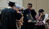 Ayah Brigadir Nofriansyah Yosua Hutabarat, Samuel Hutabarat menerima ijazah dari Rektor Universitas Terbuka (UT) Ojat Darojat saat mewakili anaknya mengikuti prosesi wisuda di Universitas Terbuka (UT) di Pamulang, Tangerang Selatan, Banten, Selasa (23/8/2022). Brigadir J tercatat sebagai mahasiswa Program Studi Ilmu Hukum, Fakultas Hukum dan Ilmu Sosial dan Ilmu Politik di Unit Program Belajar Jarak Jauh Universitas Terbuka Jambi yang terdaftar sejak 2015. Dia lulus memuaskan dengan IPK 3,28. Kehadiran Ayahnya saat prosesi wisuda didampingi saudaranya Ramos Hutabarat dan kerabat satu marga Irma Hutabarat. Republika/Thoudy Badai (FOTO : Republika/Thoudy Badai)