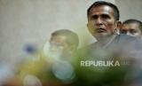 Ayah Brigadir Nofriansyah Yosua Hutabarat, Samuel Hutabarat (tengah) saat mewakili anaknya mengikuti prosesi wisuda di Universitas Terbuka (UT) di Pamulang, Tangerang Selatan, Banten, Selasa (23/8/2022). Brigadir J tercatat sebagai mahasiswa Program Studi Ilmu Hukum, Fakultas Hukum dan Ilmu Sosial dan Ilmu Politik di Unit Program Belajar Jarak Jauh Universitas Terbuka Jambi yang terdaftar sejak 2015. Dia lulus memuaskan dengan IPK 3,28. Kehadiran Ayahnya saat prosesi wisuda didampingi saudaranya Ramos Hutabarat dan kerabat satu marga Irma Hutabarat. Republika/Thoudy Badai (FOTO : Republika/Thoudy Badai)
