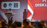 Menteri Komunikasi dan Informatika Johnny G Plate memberikan sambutan dalam acara Kick Off Dialog Publik RKUHP di Jakarta, Selasa (23/8/2022). Kegiatan tersebut dilaksanakan sebagai upaya melakukan sosialisasi dan edukasi yang bertujuan meningkatkan pemahaman masyarakat serta partisipasi publik dalam pembahasan RKUHP. (FOTO : Prayogi/Republika.)