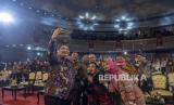 Menko Perekonomian Airlangga Hartarto (kiri) berswafoto bersama Ketua Dewan Komisioner Otoritas Jasa Keuangan (OJK) Mahendra Siregar (keempat kiri), Anggota Dewan Komisioner OJK Bidang Edukasi dan Perlindungan Konsumen Friderica Widyasari Dewi (keempat kiri bawah), Kepala Eksekutif LPS Lana Soelistianingsih (kedua kanan) serta para pelajar dan mahasiswa pada acara peluncuran Program SiMuda Gen 2 Kreasimuda Indonesia 2022 di Jakarta, Selasa (23/8/2022). Program yang diselenggarakan oleh OJK dalam rangka peringatan Hari Indonesia Menambung tersebut bertujuan untuk mendorong agar setiap pelajar berusia di bawah 18 tahun memiliki setidaknya satu rekening tabungan di bank. (FOTO : ANTARA/Muhammad Adimaja)