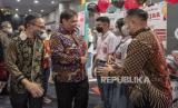 REPUBLIKA.CO.ID, JAKARTA -- Menko Perekonomian Airlangga Hartarto bersama Ketua Dewan Komisioner Otoritas Jasa Keuangan (OJK) Mahendra Siregar meninjau stan Bank DKI pada acara peluncuran Program SiMuda Gen 2 Kreasimuda Indonesia 2022 di Jakarta, Selasa (23/8/2022).