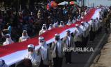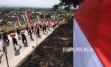 Peserta membentangkan Bendera Merah Putih sepanjang 165 meter saat Kirab Kebangsaan di Kaki Gunung Merapi, Sukabumi, Cepogo, Boyolali, Jawa Tengah, Selasa (23/8/2022). Selain untuk memperingati HUT ke-77 Kemerdekaan Republik Indonesia, Kirab Kebangsaan yang diikuti warga setempat itu juga untuk memperingati Haul Sayid Sholeh Yasin Akbar Bin Yahya yang bertujuan untuk menanamkan kebhinekaan dan kebangsaan bagi generasi muda. (FOTO : ANTARA /Aloysius Jarot Nugroho)