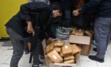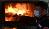 Petugas Bareskrim Polri memasukkan salah satu barang bukti narkotika ke dalam incinerator (alat pembakar) di Instalasi Kesling, RSPAD Gatot Soebroto, Jakarta, Rabu (24/8/2022). Bareskrim Polri memusnahkan barang bukti berupa sabu sebanyak 8.742,2 gram, ganja 295.363 gram, serta 29.083 butir pil ekstasi dari 13 kasus dengan total 28 tersangka dari Jabodetabek, Lampung, Aceh, Jambi, dan Cirebon selama periode operasi 25 Mei 2022 hingga 20 Juli 2022. (FOTO : ANTARA/Aditya Pradana Putra)