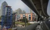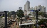 Pekerja beraktivitas di area pembangunan skywalk di kawasan Kebayoran Lama, Jakarta, Rabu (24/8/2022). Pembangunan skywalk yang akan menghubungkan Stasiun Kebayoran dengan Halte Transjakarta Koridor 8 dan 13 tersebut kini sudah mencapai 30 persen dan ditargetkan rampung pada bulan Oktober 2022. (FOTO : Republika/Putra M. Akbar)