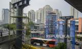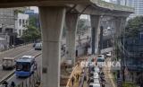 Bus Transjakarta melintas di dekat tiang pondasi yang telah terpasang untuk pembangunan skywalk di kawasan Kebayoran Lama, Jakarta, Rabu (24/8/2022). Pembangunan skywalk yang akan menghubungkan Stasiun Kebayoran dengan Halte Transjakarta Koridor 8 dan 13 tersebut kini sudah mencapai 30 persen dan ditargetkan rampung pada bulan Oktober 2022. (FOTO : Republika/Putra M. Akbar)