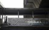 Pekrja berjalan di dekat spanduk sosialisasi pembangunan skywalk di kawasan Kebayoran Lama, Jakarta, Rabu (24/8/2022). Pembangunan skywalk yang akan menghubungkan Stasiun Kebayoran dengan Halte Transjakarta Koridor 8 dan 13 tersebut kini sudah mencapai 30 persen dan ditargetkan rampung pada bulan Oktober 2022. (FOTO : Republika/Putra M. Akbar)