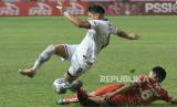Pesepak bola Persija Jakarta Mikhael Krmencik (kanan) terjatuh saat berebut bola dengan pesepak bola Persita Tangerang Agustin Cataneo (kiri) pada lanjutan Liga 1 di Stadion Patriot Chandrabhaga, Bekasi, Jawa Barat, Rabu (24/8/2022).  (FOTO : ANTARA/Fakhri Hermansyah)