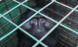 Barang bukti seekor monyet Darre (Macaca maura) berada di sangkar saat ungkap kasus tindak pidana konservasi sumber daya alam hayati dan ekosistem di Polda Jawa Timur, Surabaya, Jawa Timur, Jumat (26/8/2022). Polda Jawa Timur menangkap lima tersangka atas kasus dugaan memperniagakan satwa-satwa dilindungi secara ilegal dan mengamankan barang bukti satwa burung sebanyak 291 ekor, satwa mamalia sebanyak 11 ekor dan satwa reptil sebanyak dua ekor. (FOTO : ANTARA/Didik Suhartono)