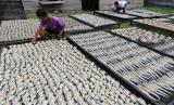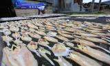 REPUBLIKA.CO.ID, ACEH BARAT -- Pekerja menjemur ikan asin di tempat produksi ikan asin Kareung Boh Gadong, Desa Kuala Bubon, Samatiga, Aceh Barat, Aceh, Jumat (26/8/2022). Sejak dua pekan terakhir, produksi berbagai jenis ikan asin mengalami penurunan hingga 70 persen dari sebelumnya akibat terkendala proses penjemuran karena pengaruh cuaca dan tingginya curah hujan.