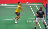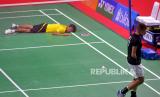 Atlet tunggal putra Para Badminton Indonesia Dheva Anrimusthi terjatuh saat melawan Atlet tunggal putra Para Badminton Polandia Bartlomiej Mroz pada final kelas tunggal putra - SU5 Foxs Indonesia Para Badminton Internasional 2022 di GOR Amongrogo, Yogyakarta, Sabtu (27/8/2022). Dheva yang menjadi unggulan tiga berhasil menjadi juara setelah mengalahkan unggulan pertama Mroz dengan skor 21-9, 21-14. (FOTO : Republika/Wihdan Hidayat)