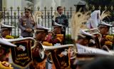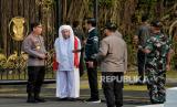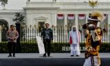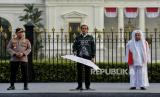 Presiden Joko Widodo (tengah) didampingi Kapolri Jenderal Listyo Sigit Prabowo (kiri) dan anggota Dewan Pertimbangan Presiden Habib Luthfi bin Yahya (kanan) berbincang sebelum melepas kegiatan kirab bendera Merah Putih di kawasan Patung Kuda, Jakarta, Ahad (28/8/2022). Sebanyak 50.000 orang membentangkan bendera merah putih sepanjang 1.700 meter dari kawasan Monas hingga Bundaran HI. Kegiatan tersebut merupakan rangkaian dalam memperingati Hari Kemerdekaan Indonesia dengan tema (FOTO : Republika/Thoudy Badai)