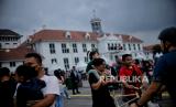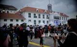 REPUBLIKA.CO.ID,JAKARTA -- Pengunjung memadati area wisata Kota Tua, Jakarta, Ahad (28/8/2022).