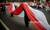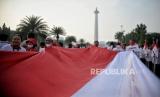Peserta membentangkan bendera merah putih di kawasan Monumen Nasional, Jakarta, Ahad (28/8/2022). Sebanyak 50.000 orang membentangkan bendera merah putih sepanjang 1.700 meter dari kawasan Monas hingga Bundaran HI. Kegiatan tersebut merupakan rangkaian dalam memperingati Hari Kemerdekaan Indonesia dengan tema (FOTO : Republika/Thoudy Badai)