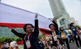 REPUBLIKA.CO.ID,JAKARTA -- Peserta membentangkan bendera merah putih di kawasan Bundaran HI, Jakarta, Ahad (28/8/2022).